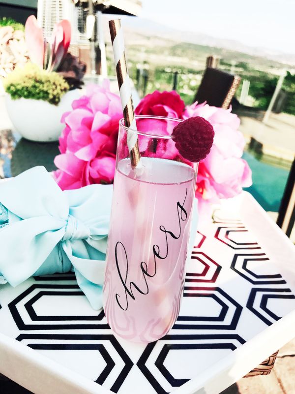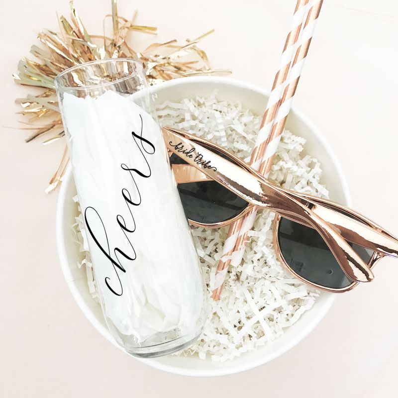 Cheers shatterproof stemless flutes are perfect for bridal showers, bacheloretters, or bridesmaid proposals! Each set of six shatterproof hard plastic flute comes with cheers printed in black. Add metallic foil straws or drink stirrers for even more sparkle!