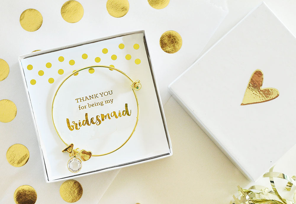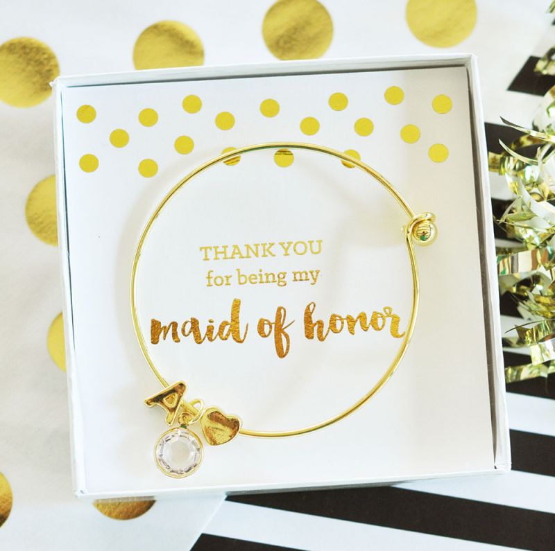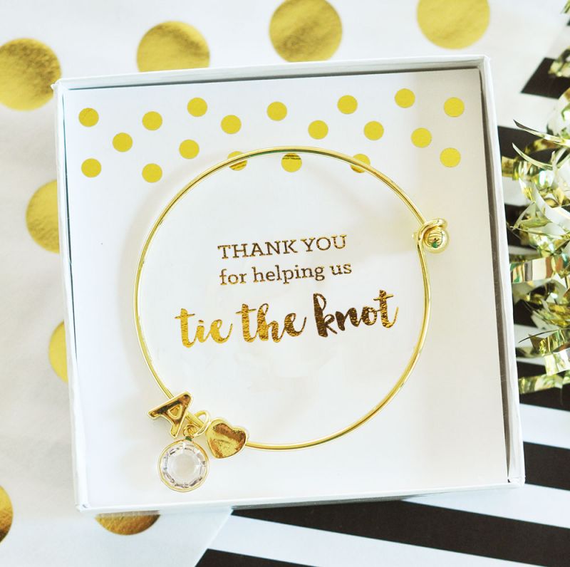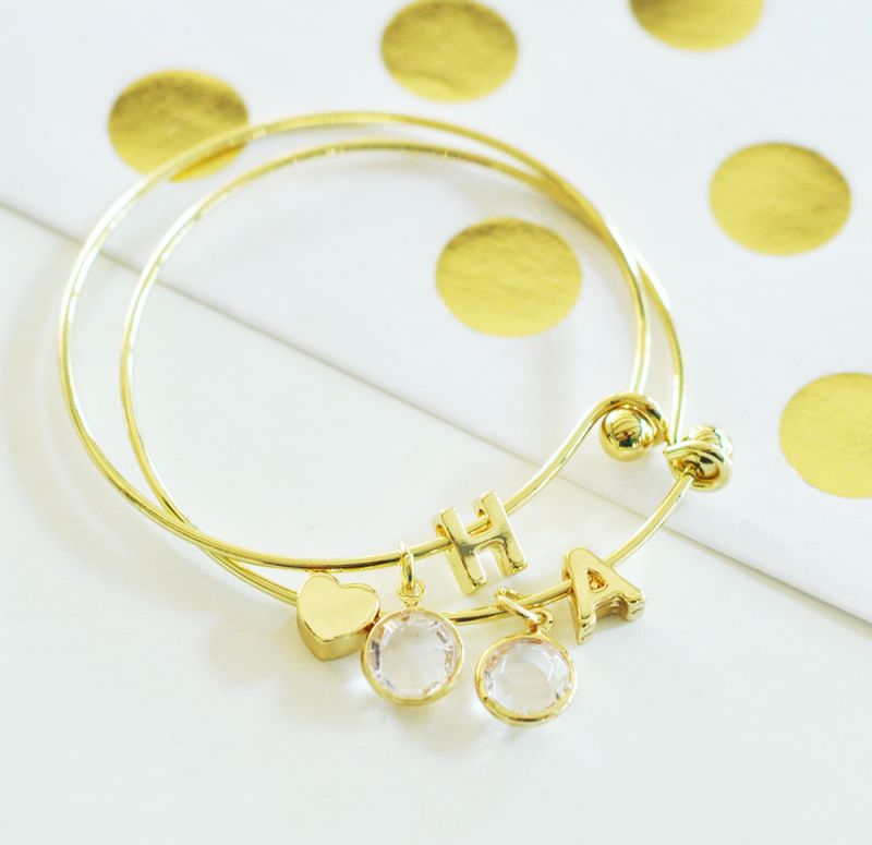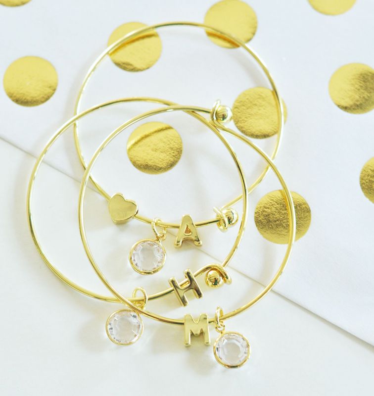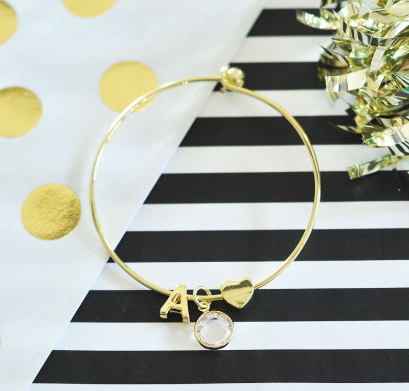 Gold Monogram Bracelets make glamorous gifts for your bridesmaids, bridal party, or or even for a birthday! These 18k plated gold bracelets come with a personalized monogram initial, heart charm and a glitzy gem. Add a signature heart topped gift box to complete the gift package!
